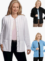 You'll love the look of this classic cable and pointelle knit cardigan. Beautifully styled, it has front buttons and pockets, ribbed bottom and cuffs. Made in the USA of machinewash- and-dry acrylic.