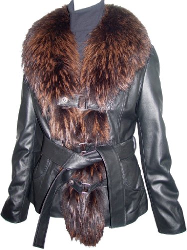 Cheap "4002furliner Real Fur Lined Genuine Black Soft Supple Light Lambskin Leather Short Jacket Laydown Collar, Hook Eye Leather Strap Snap Front Closure, Detachable Real Raccoon Collar Tuxedo Cuff, Lined, ZIP OUT SECTION REAL REX FUR VELOUR LINER, Waist Leather Belt, Petite Regular Plus Size" Discount review update price today